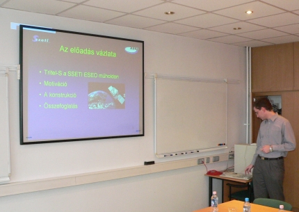 2007. I. 19. - Államtitkári látogatás a BME-n - Kovács Kálmán környezetvédelmi és vízügyi államtitkár, a Magyar Űrkutatási Tanács elnöke, 2007. január 18-án meglátogatta a Budapesti Műszaki és Gazdaságtudományi Egyetem Szélessávú Hírközlés és Villamosságtan Tanszékének Űrkutató Csoportját. A Csoport az SSETI program keretében az ESEO európai diákműhold tápellátó rendszerének fejlesztésén dolgozik, mely munka elkezdéséhez a KvVM 3 millió Ft támogatást nyújtott. Államtitkár úr a látogatás alkalmával tárgyalt dr. Zombory László tanszékvezető úrral és dr. Gschwindt Andrással, az Űrkutató Csoport vezetőjével. Ezt követően megtekintette a Csoport által rendezett alkalmi kiállítást, mely a Tanszéken végzett űrmérnöki munka történetébe nyújtott betekintést. Ezután három előadásra került sor, melyeket az ESEO műholdhoz építendő 3 magyar műszer, a tápegység-rendszer, a TriTel doziméter és a Langmuir-detektor vezető fejlesztő hallgatói, Kocsis Gábor, Hirn Attila és Játékos Balázs tartottak. A látogatás végeztével a MŰT elnöke hangsúlyozta, fontosnak és lehetségesnek tartja a magántőke bevonását az igen jelentős magyar részvétellel építendő diákműhold költségeinek finanszírozásába.  A MŰT elnöke az Űrkutató Csoport vezetőjével és a tanszékvezetővel tárgyal. Balról jobbra: Kovács Kálmán KvVM államtitkár, dr. Both Előd, a MŰI igazgatója, dr. Gschwindt András, az Űrkutató Csoport vezetője és dr. Zombory László tanszékvezető Kovács Kálmán dr. Gschwindt András kíséretében megtekinti az Űrkutató Csoport eddigi működését bemutató kiállítást. Hirn Attila PhD hallgató az ESEO műhold tudományos műszerei között helyet kapó TriTel doziméterről tart előadást