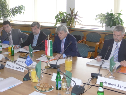 A tárgyalások 11 órakor kezdődtek. Az ESA részéről René Oosterlinck kükapcsolati igazgató, Chris de Cooker külkapcsolati főosztályvezető, Eric Morel de Westgraver közbeszerzési és iparpolitikai főosztályvezető, Martin Brady pénzügyi főosztályvezető, valamint Catherine Baudin és Anabelle Fonseca-Colomb, a Pénzügyi, illetve a Külkapcsolati Főosztályok munkatársai képviselték. Magyar részről jelen voltak Kovács Kálmán környezetvédelmi és vízügyi államtitkár, dr. Both Előd, a Magyar Űrkutatási Iroda igazgatója, Vajda Attila a KvVM Államtitkárságáról, dr. Szegő Károly, a Magyar Tudományos Akadémia Kutatásfejlesztési és Innovációs Főosztályának vezetője, Solymosi János, a Bonn-Magyarország Kft. űripari igazgatója, Petrezselyem Ilona, a KvVM Költségvetési, Beruházási és Tulajdonosi Főosztálya vezetőjének helyettese, dr. Elek Andrea, a KvVM Közösségi és Nemzetközi Főosztálya vezetőjének helyettese, valamint a munkaebéden dr. Almár Iván, az Űrkutatási Tudományos Tanács elnöke.  Kovács Kálmán államtitkár úr üdvözli a tárgyalások megkezdését. (Balról jobbra: Vajda Attila, dr. Both Előd, Kovács Kálmán és Solymosi János)