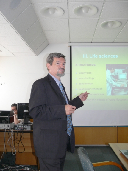 A tárgyalási forduló elején államtitkár úr üdvözölte a delegációk megjelent tagjait, felelevenítette Magyarország és az ESA kormányszintű kapcsolatainak történetét, az 1991-es Általános Megállapodástól a PRODEX egyezményen át a 2003-tól érvényes Európai Együttműködő Állam Terve Megállapodásig. Kovács Kálmán elmondta, a PECS Megállapodás is szükségessé teszi ezt a tárgyalást, aláhúzta, magasabb szinten szeretnék folytatni az ESA-val való együttműködést. René Oosterlinck úr szintén bemutatta Magyarország és az ESA eddig is gyümölcsöző kapcsolatait, üdvözölte a hivatalos csatlakozási tárgyalások megkezdését, bemutatta az ESA-delegáció tagjait. Ezután dr. Both Előd igazgató úr mutatta be a magyar űrtevékenységet, kiemelve nemzetközi kapcsolatainkat, valamint a hazai űripar elmúlt években tapasztalható fejlődését.  René Oosterlinck úr áttekinti az ESA-magyar kapcsolatok történetét, helyzetét (mellette balra Eric Morel de Westgraver, jobbra Chris de Cooker)