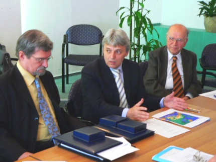 Az ŰTT ülésén a Magyar Űrkutatási Tanács elnöke is részt vett (balról jobbra: dr. Both Előd, a MŰI igazgatója, Kovács Kálmán környezetvédelmi és vízügyi államtitkár, a MŰT elnöke, valamint dr. Almár Iván, az Űrkutatási Tudományos Tanács elnöke)