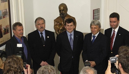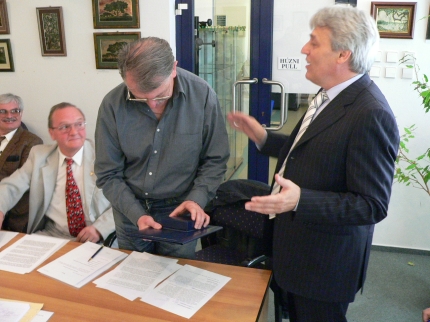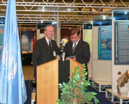 2007. VI. 11. - Az ENSZ Világűriroda igazgatójának kitüntetése - Az EURISY Szövetség (amelynek a Magyar Űrkutatási Iroda is tagja) a néhány éve alapított magas kitüntetésével, az évente egyszer adományozható Hubert Curien-díjjal ismerte el Sergio Camacho-Lara, az ENSZ Világűriroda június végén nyugdíjba vonuló igazgatója munkásságát. Sergio Camacho huszonöt éve volt az OOSA (UN Office for Outer Space Affairs) munkatársa, az utóbbi öt évben pedig igazgatója. A kitüntetést Colin Hicks, az EURISY elnöke Bécsben, az űrkutatás első 50 évét bemutató kiállítás megnyitóján adta át az OOSA igazgatójának.  Colin Hicks úr (balra) átadja a kitüntetést Sergio Camacho-Larának (jobbra)