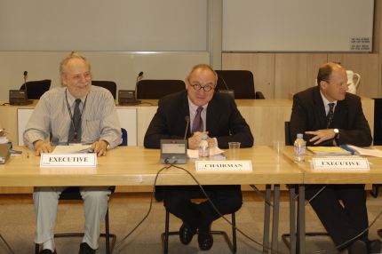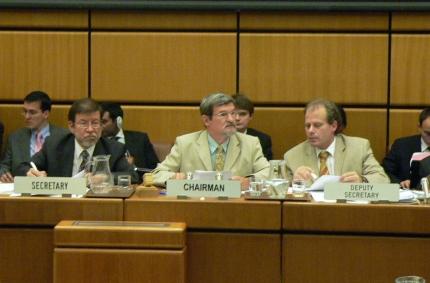 2007. VI. 15. - Véget ért a COPUOS ülésszaka - Bécsben befejeződött az ENSZ Világűrbizottság (COPUOS) jubileumi, 50. ülésszaka. A péntek délutáni - estébe nyúló - ülést Gérard Brachet elnök távollétében a Világűrbizottság elnöki funkcióját betöltve, a COPUOS első alelnöke, dr. Both Előd, a MŰI igazgatója, zárta be.  Gerard Brachét után dr. Both Előd látta el a COPUOS elnöki teendőit (balról jobbra: Sergio Camacho-Lara, az ENSZ Világűriroda igazgatója, a COPUOS titkára, dr. Both Előd, a COPUOS első alelnöke, levezető elnök, valamint Niklas Hedman, az OOSA osztályvezetője, a COPUOS helyettes titkára)