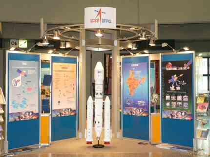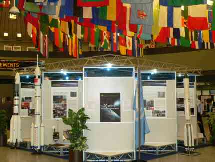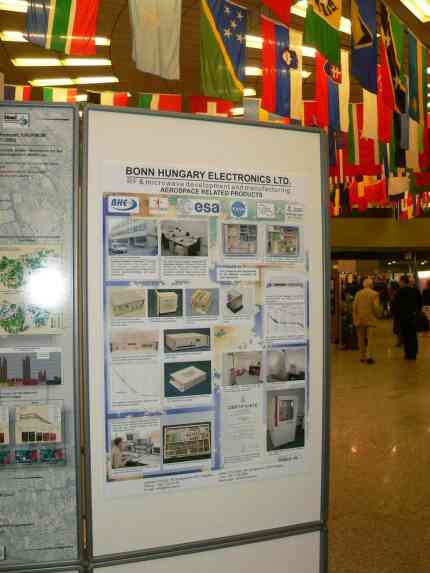 poszteren mutatja be tevékenységét.  Gérard Brachet, az ENSZ Világűrbizottságának elnöke megnyitja a kiállítást Az Indiai Űrkutatási Szervezet (ISRO) kiállítása Az ENSZ által felállított kiállítás A magyar kiállítás részlete - a Bonn-Magyarország Kft. tablója