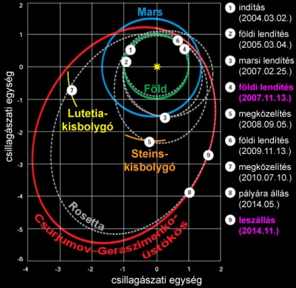 A Rosetta-küldetés elsődleges célpontja, a Csurjumov-Geraszimenko-üstökös óriási sebességgel száguld a Naprendszer belső része felé. Így megközelítése csak többszöri gyorsítással, igen bonyolult útvonalon lehetséges - ez leginkább egy kozmikus biliárdjátszmára emlékeztet, amelyben egy apró pontatlanság is a várt találkozás elmaradását idézheti elő. A Mars mellett egyszer, a Föld mellett pedig már kétszer is kapott lendületet az úgynevezett gravitációs hintamanőverek során, s közben 2008-ban a Steins-kisbolygót is megközelítette.