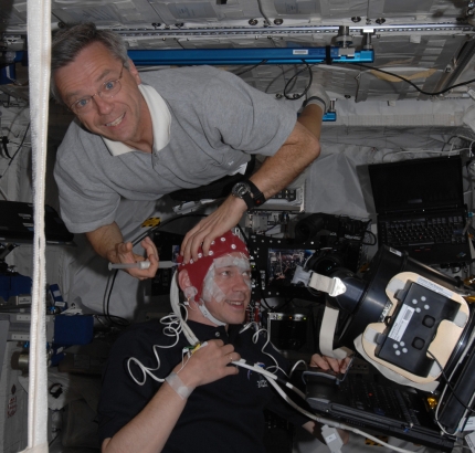 Frank De Winne űrhajós az EEG készülékkel - a mérésben Robert Thirsk kanadai űrhajós segít neki (De Winne fölött lebeg) - Forrás: Kanadai Űrügynökség