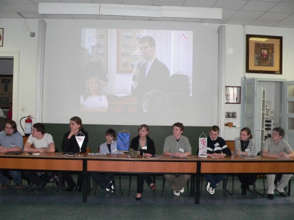 A kilenc diák, akiknek megadatott, hogy rövid időre beszélhessenek a Nemzetközi Űrállomáson tartózkodó Simonyi Károllyal - fölöttük a kivetítőn Bacsárdi László beszél