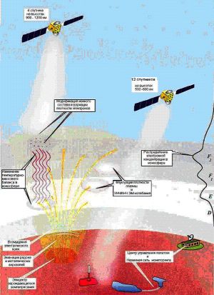 A Vulkán projekt felépítési vázlata: A földrengés epicentrumából származó ULF-VLF jelek az inhomogén ionoszférán át jutnak el a 4 magasabb és a 12 alacsonyabb pályán keringő Vulkán hold valamelyikéhez vagy többhöz is, amelyek aztán a vett jeleket a követő állomásoknak továbbítják.