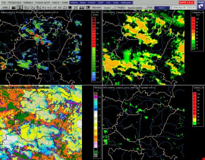 balra fent: radarral mért csapadék intenzitás, a másik 3 kép a SAFNWC programcsomag eredménye: balra lent: felhőtípus osztályozott kép, jobbra fent: a gyenge és közepes erősségű csapadékhullás valószínűsége, jobbra lent: a heves csapadékhullás valószínűsége.
