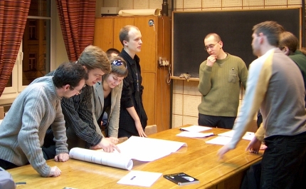 A lengyel diákok egy csoportja, valamint Dianiska Balázs és Horvai Ferenc (ők ketten balra) a PW-Sat diákműhold terveiről folytatnak megbeszélést (fotó: Dianiska Balázs)