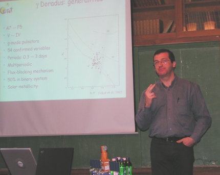 2007. III. 19. - COROT-nap a Csillagászati Kutatóintézetben - A Magyar Űrkutatási Iroda társrendezésében március 12-én egynapos tudományos konferenciát szervezett az MTA Konkoly Thege Miklós Csillagászati Kutatóintézete a 2006. december 27-én Föld körüli pályára állított, európai közreműködéssel épített francia COROT (Convection, Rotation and Planetary Transit, Corot) űrtávcső programjával, illetve a programhoz történt magyar hozzájárulással kapcsolatban. A tudományos napon dr. Paparó Margit, a Magyar Asztroszeizmológiai Csoport vezetője, dr. Ennio Poretti, dr. Philippe Mathias külföldi szakértők, valamint dr. Kolláth Zoltán, dr. Szabados László, dr. Benkő József, Csubry Zoltán, Sódorné Bognár Zsófia, Molnár László, Plachy Emese, Kerekes Gyöngyi és Pápics Péter adtak elő. A rendezvényt dr. Both Előd, a Magyar Űrkutatási Iroda igazgatója nyitotta meg.  Dr. Philippe Mathias a Gamma Doradus csillagokról tart előadást a COROT-napon