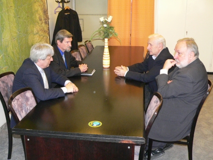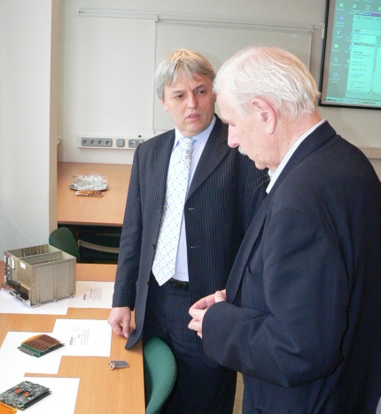 2007. I. 19. - Államtitkári látogatás a BME-n - Kovács Kálmán környezetvédelmi és vízügyi államtitkár, a Magyar Űrkutatási Tanács elnöke, 2007. január 18-án meglátogatta a Budapesti Műszaki és Gazdaságtudományi Egyetem Szélessávú Hírközlés és Villamosságtan Tanszékének Űrkutató Csoportját. A Csoport az SSETI program keretében az ESEO európai diákműhold tápellátó rendszerének fejlesztésén dolgozik, mely munka elkezdéséhez a KvVM 3 millió Ft támogatást nyújtott. Államtitkár úr a látogatás alkalmával tárgyalt dr. Zombory László tanszékvezető úrral és dr. Gschwindt Andrással, az Űrkutató Csoport vezetőjével. Ezt követően megtekintette a Csoport által rendezett alkalmi kiállítást, mely a Tanszéken végzett űrmérnöki munka történetébe nyújtott betekintést. Ezután három előadásra került sor, melyeket az ESEO műholdhoz építendő 3 magyar műszer, a tápegység-rendszer, a TriTel doziméter és a Langmuir-detektor vezető fejlesztő hallgatói, Kocsis Gábor, Hirn Attila és Játékos Balázs tartottak. A látogatás végeztével a MŰT elnöke hangsúlyozta, fontosnak és lehetségesnek tartja a magántőke bevonását az igen jelentős magyar részvétellel építendő diákműhold költségeinek finanszírozásába.  A MŰT elnöke az Űrkutató Csoport vezetőjével és a tanszékvezetővel tárgyal. Balról jobbra: Kovács Kálmán KvVM államtitkár, dr. Both Előd, a MŰI igazgatója, dr. Gschwindt András, az Űrkutató Csoport vezetője és dr. Zombory László tanszékvezető Kovács Kálmán dr. Gschwindt András kíséretében megtekinti az Űrkutató Csoport eddigi működését bemutató kiállítást. Hirn Attila PhD hallgató az ESEO műhold tudományos műszerei között helyet kapó TriTel doziméterről tart előadást