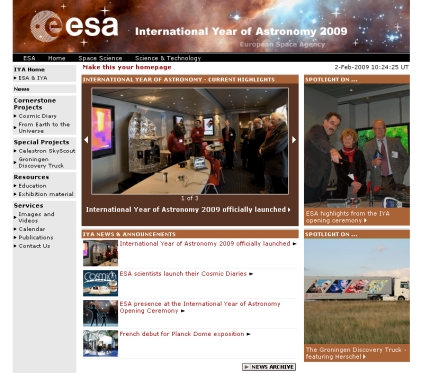 2009. II. 2. - Az ESA új weboldalt indított a Csillagászat Nemzetközi Éve alkalmából - Galilei 400 esztendővel ezelőtt, 1609-ben fordította először távcsövét az égbolt felé - tudományos igényű megfigyeléseivel új fejezetek sorát nyitotta a csillagászatban, megreformálva ezzel világról és emberről alkotott képünket. A Galilei által leginkább tanulmányozott terület természetesen a Naprendszer volt. Napjainkban az Európai Űrügynökség (az Egyesült Államok mellett) élen jár a Naprendszer kutatásában, melyben így magyar egyetemek és kutatóhelyek is részt vesznek. Nem véletlen tehát, hogy a Csillagászat Nemzetközi Éve (IYA) alkalmából az ESA saját honlapot hozott létre, gazdag tartalommal. A honlap elérhető a astronomy2009.esa.int címen. (Az IYA hivatalos magyar nyelvű oldala: csillagaszat2009.elte.hu.)