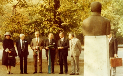 Hermann Oberth Budapesten 1983-ban, Kármán Tódor szobrának megkoszorúzásakor (balról a második)