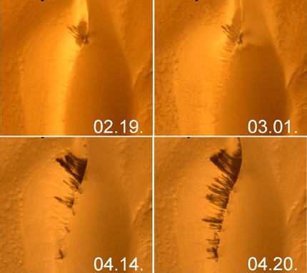 Az MRO szonda HiRISE detektorának négy egymás után készült képe az északi féltekén, a helyi tavasszal növekvő lefolyásos alakzatokról egy marsi dűne oldalán (NASA, JPL, COLBUDMAG)